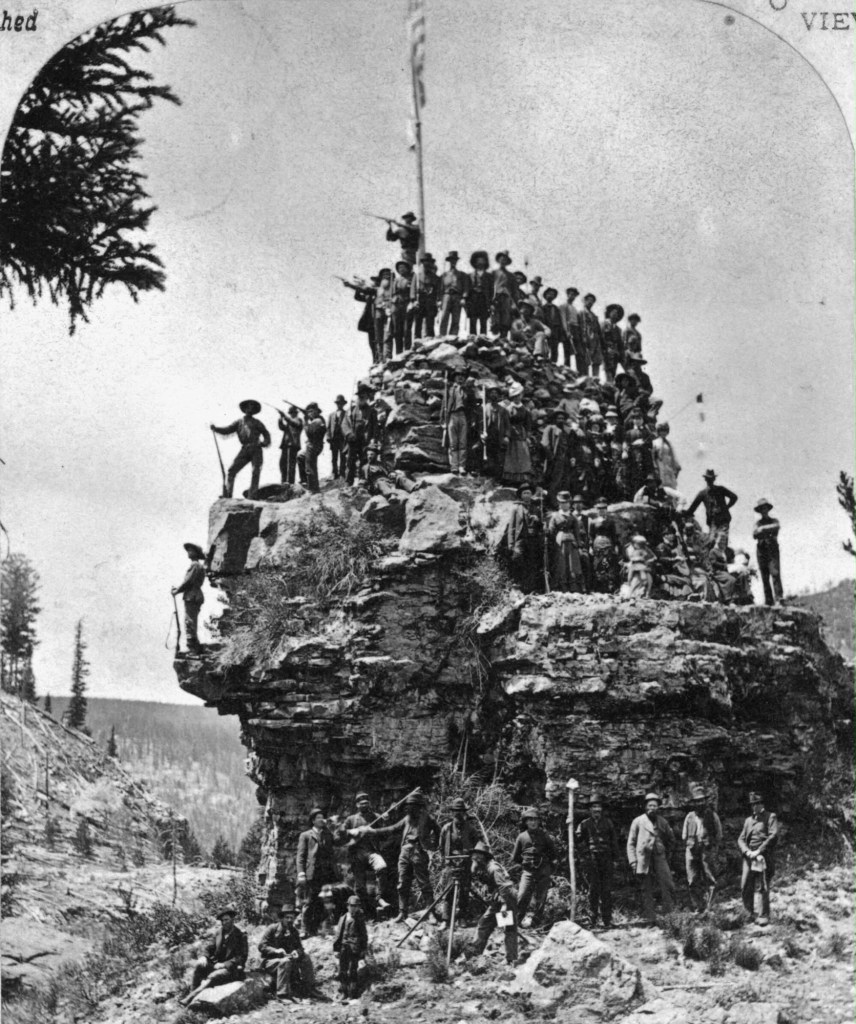 Mr. Arnett, a prospector, camped at the site in 1870 heard rumors that a ranch nearby had been attacked and burned. The fear of an attack felt imminent and he took action. Hearing that a band of Utes were coming up the river to fight, Arnett build a fort quickly and stayed near the junction of Turkey Creek to protect the settlement. When the residents stayed near the fort for several days, no incidents arose and the alarm faded. Life returned to normal for the settlers and the town began to grow. The photo of the tock mound from the Denver Library was taken in 1880. The mound is still there, and there is a flag on top, I didn’t get a current photo!