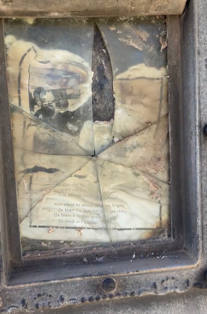 Behind the glass is the original obituary, the obituary is so old is it near unreadable. Be sure to view the video on this one. This feature is pretty unique and popular for a short time.