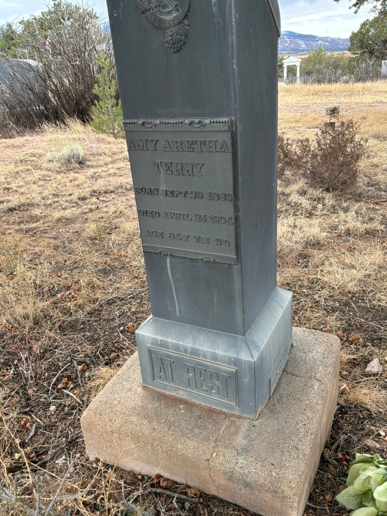 Born in Holden, Johnson County, Missouri, September 23, 1869. Removed to Colorado with her parents in the year 1873. Was married to Charles W. Terry at Canon City, Sept. 25, 1894. She died of heart trouble at Texas Creek, Colorado, April 25, 1904, while visiting with her sister, Mrs. Minnie Gilman. She leaves Husband, Father, Mother: five brothers- Charles F., George E., James O., John F., Leroy H.; and five sisters-Sarah L., Dora I., Minnie E., Maud A., and Lula M., to mourn their loss. She was kind, loving and obedient to all and her place can never be filled. “