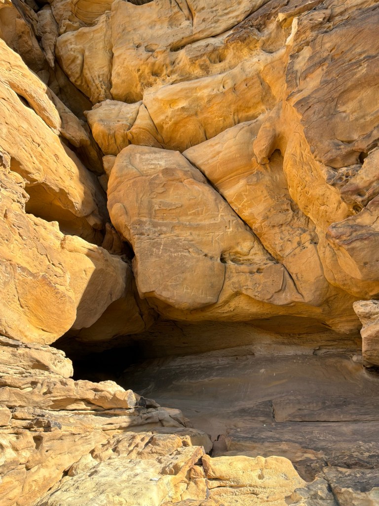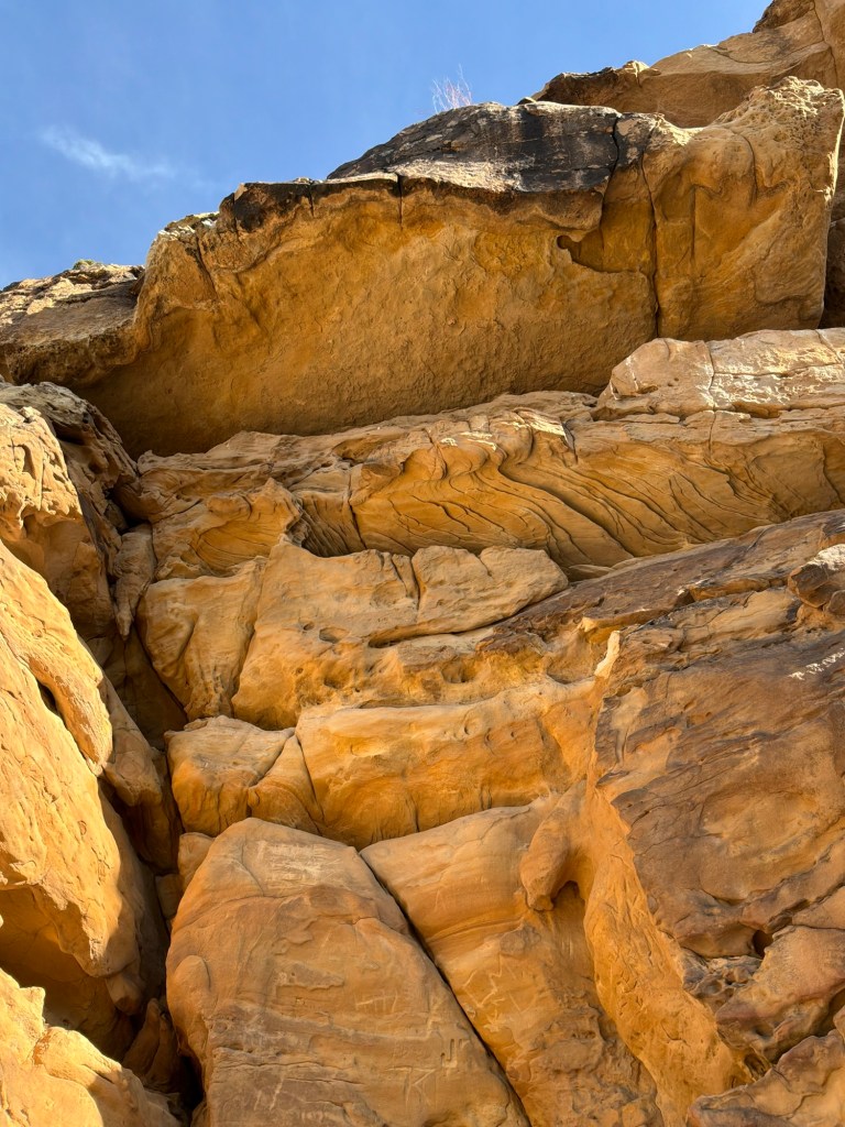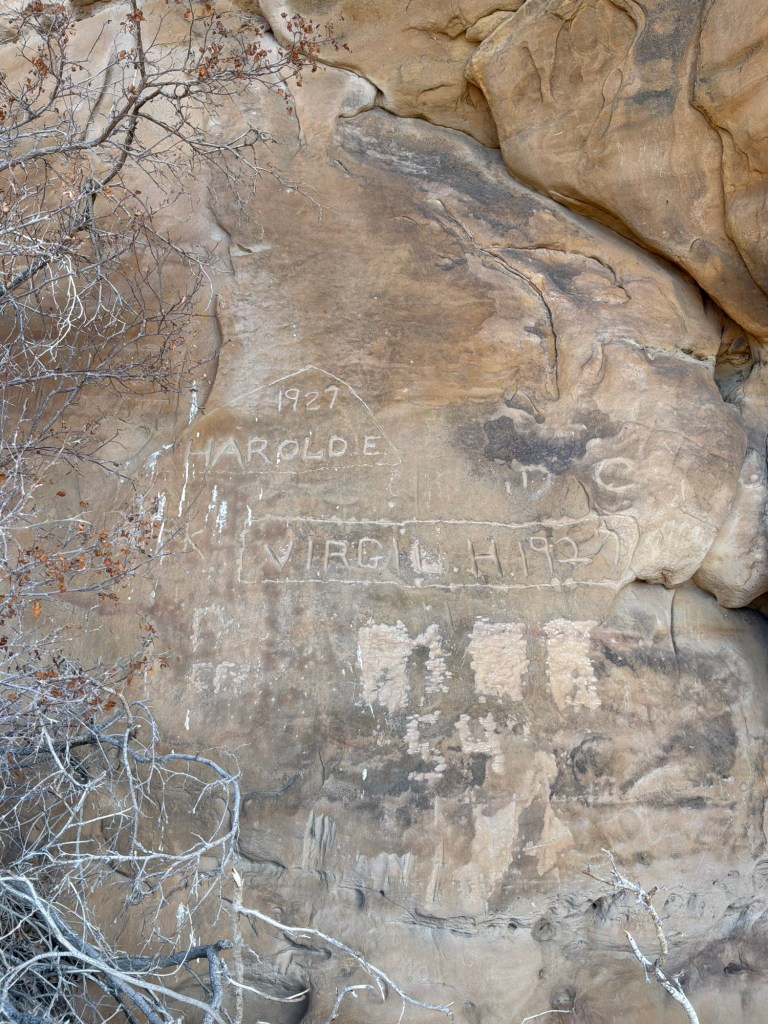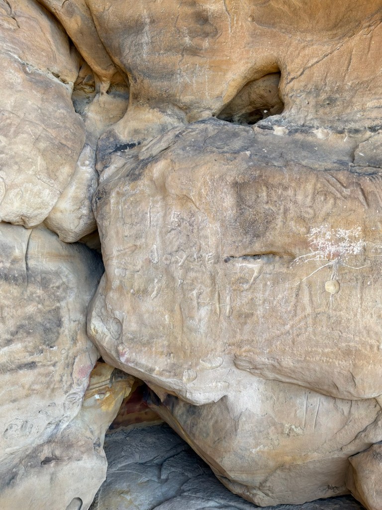 Up on the cliffs, there were several carvings from the 20s, as well some from much, much earlier times. The Petroglyphs are there, but are worn away in spots. The drawings were so beautiful, you really must study and look deep to see some of them. The Petroglyphs are a little harder to see than the graffiti, it has weathered for a very long time. A story of the valley left on the walls for what would be an eternity then. I really hope they don’t fade away completely!
