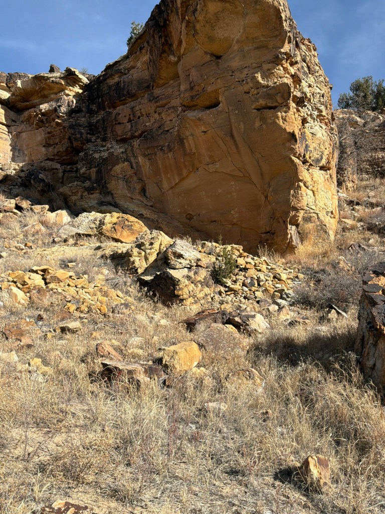 This valley was used for hunting Bison, Elk and Antelope centuries ago. Barlow and Sanderson Stage Line, a Santa Fe Trail spur, used this spot as a stop connecting Las Animas and LaJunta circa 1870. Remnants of a stagecoach building remain and can be seen along a Trail. A homestead also remains from settlers who lived there in the 30s. I have included video of the homestead’s remaining ruins and chimney. The use of local stones stacked still remain on the hillside opposite of the engraved cliffs. Other trails have wagon trails and span the upper areas above the valley.