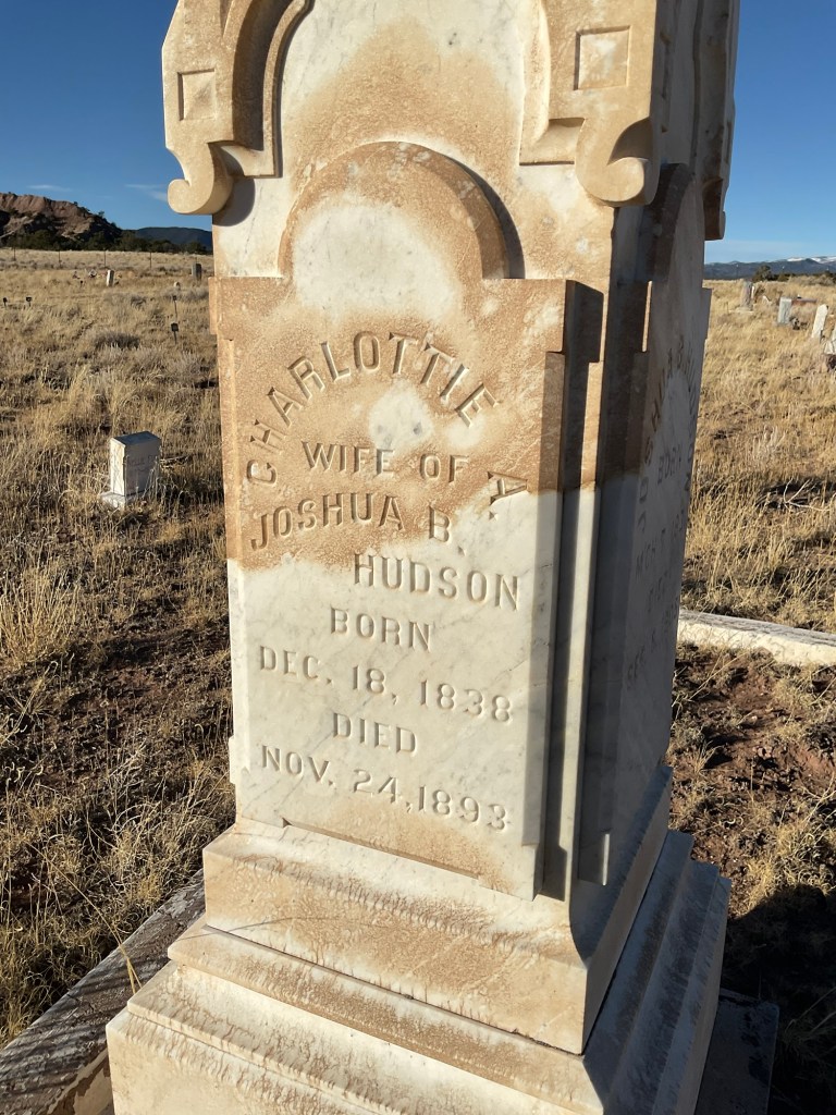 Charlottie Ann McCabe Hudson, Born December 18th, 1839 – Died November 24th, 1893 “Wife of Joshua B Hudson” inscribed on her side of the stone.