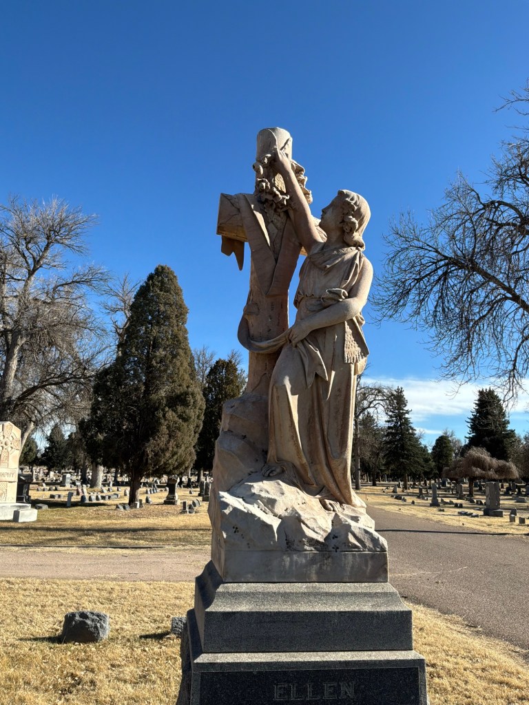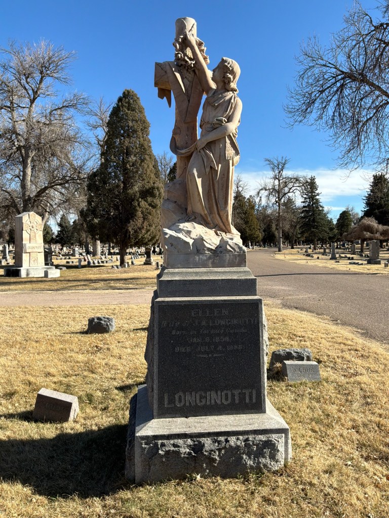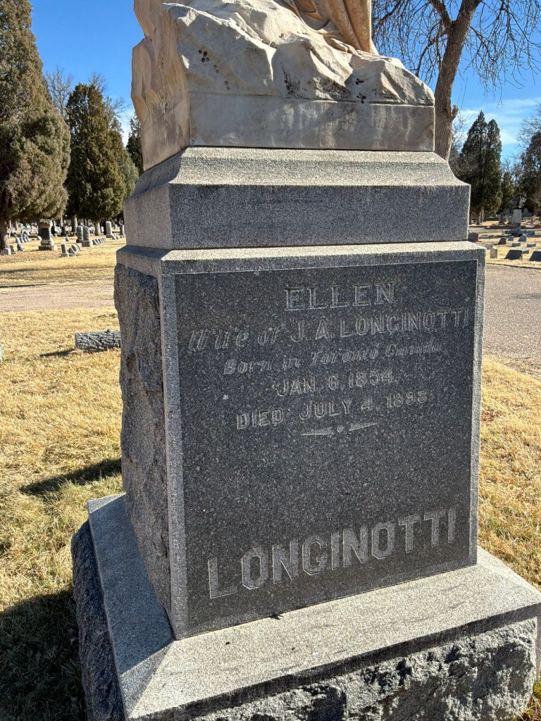 Here’s a story and grave from Roselawn Cemetery in Pueblo, Colorado. Ellen Longinotti, Wife of James A Longinotti, died July 5th, 1898 at her home in Pueblo of acute heart trouble. Her passing was unexpected according to the Pueblo Chieftain publication. She left behind three children and her husband to mourn for her.